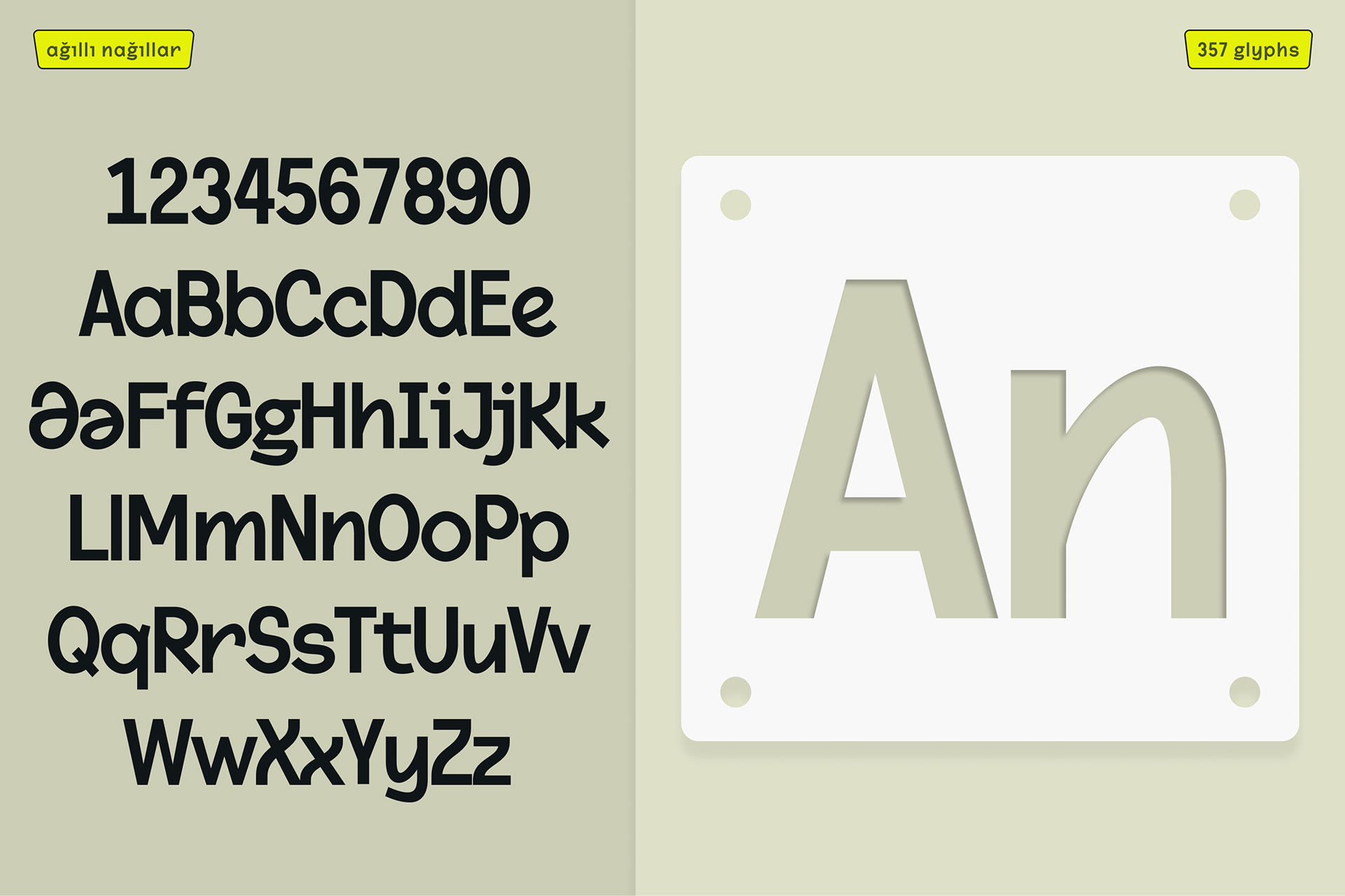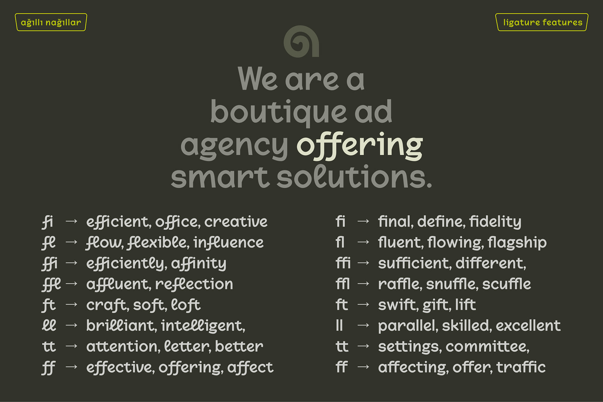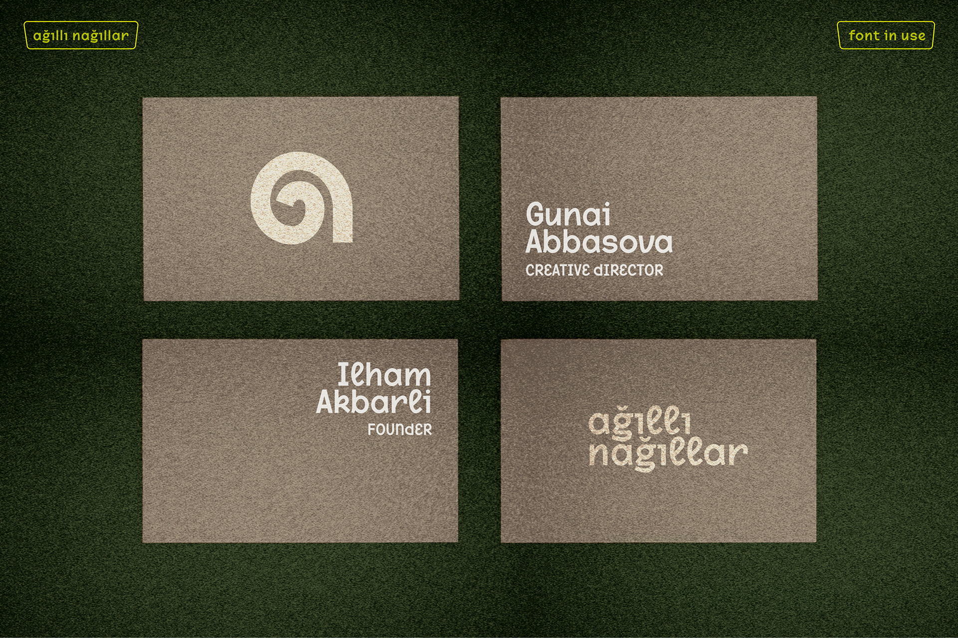 Ağıllı Nağıllar — an exclusive corporate typeface for the advertising agency. The Ağıllı Nağıllar typeface was created exclusively for the advertising agency of the same name. Serving as a central element of the agency’s visual identity, it forms the basis of the logo and acts as the brand’s primary communication tool.